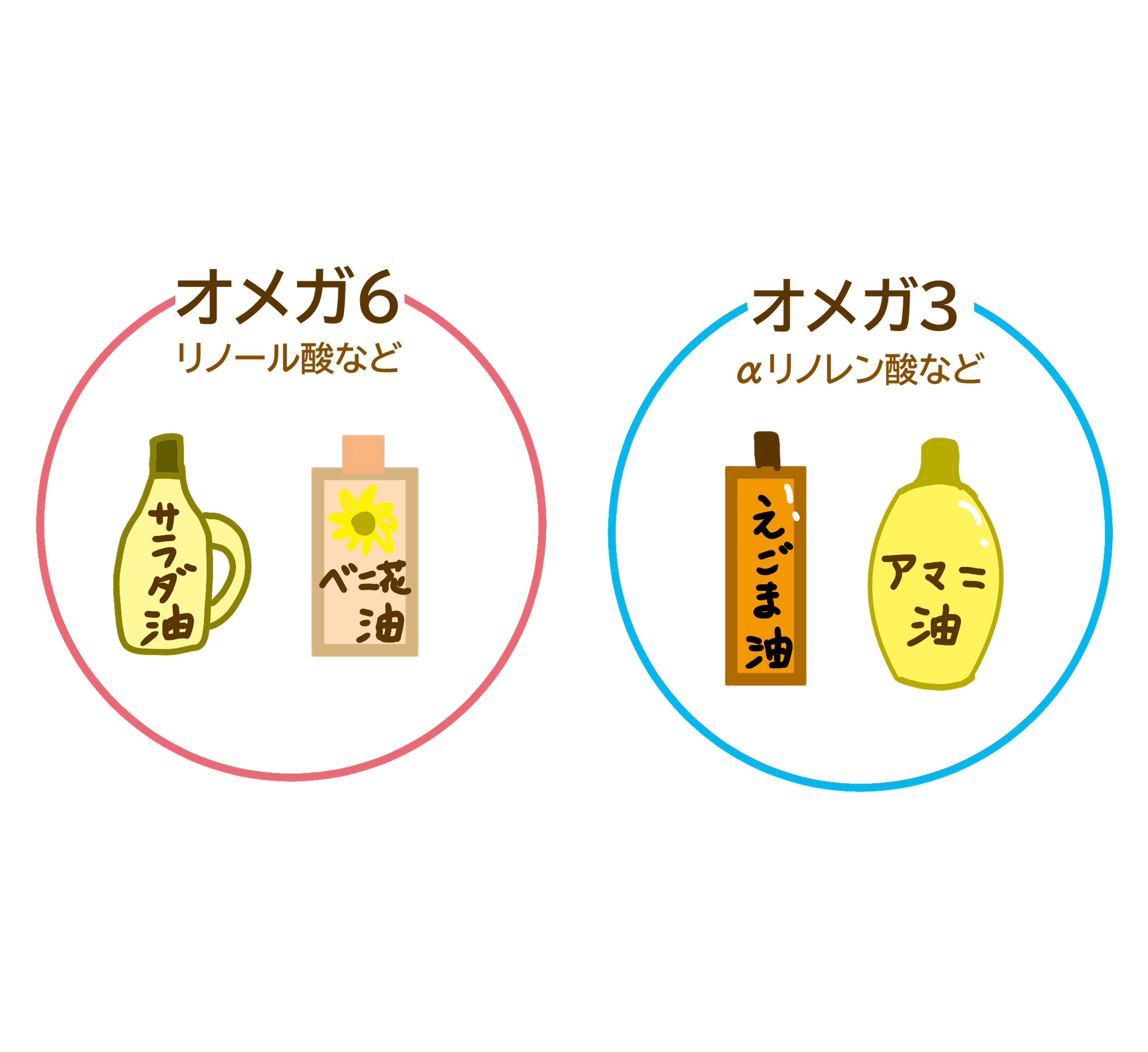 どれも前者は「ω-6系脂肪酸」「トランス脂肪酸」など、